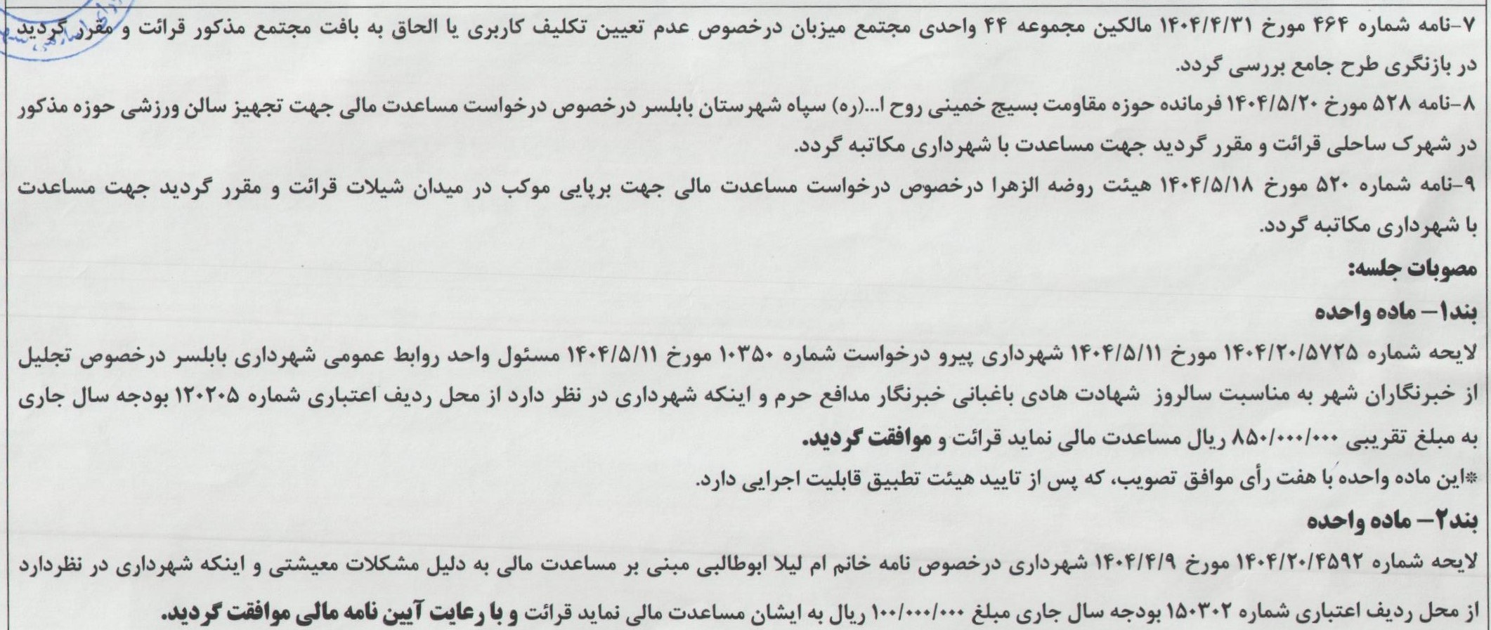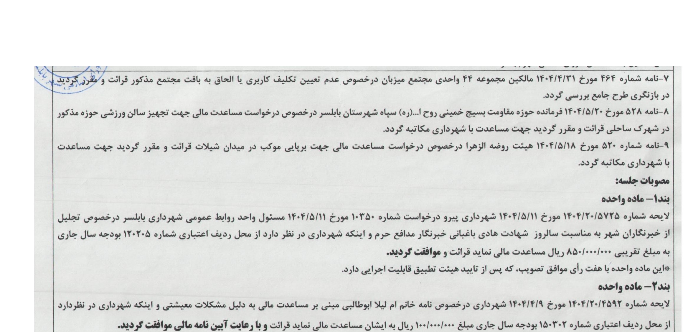 صفحه اصلی » مصوبات » جلسه 207 شورای اسلامی شهر بابلسر مورخ 1404/05/27 به ریاست آقای مهدی باقرزاده و با حضور اعضای شورای اسلامی شهر بابلسر برگزار گردید