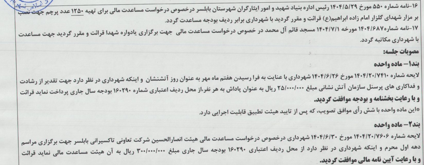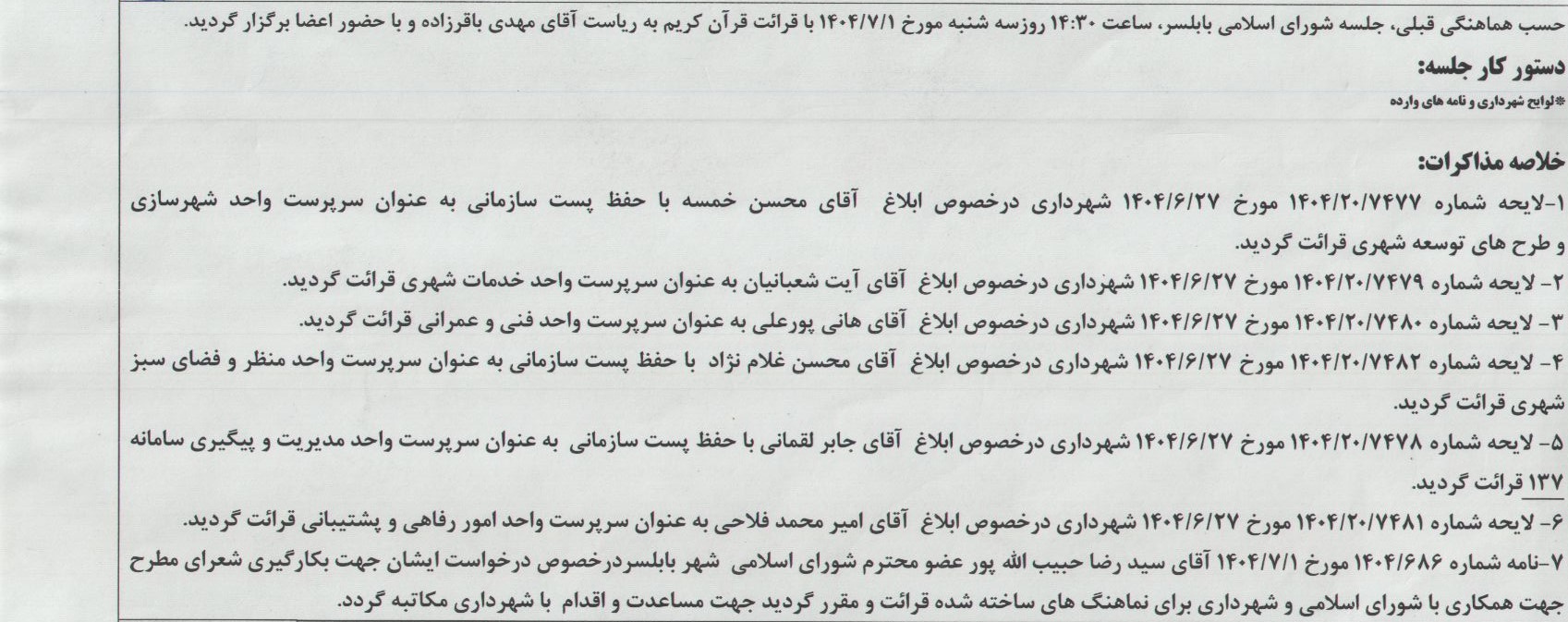 صفحه اصلی » مصوبات » جلسه 211 شورای اسلامی شهر بابلسر مورخ 1404/07/01 به ریاست آقای مهدی باقرزاده و با حضور اعضای شورای اسلامی شهر بابلسر برگزار گردید