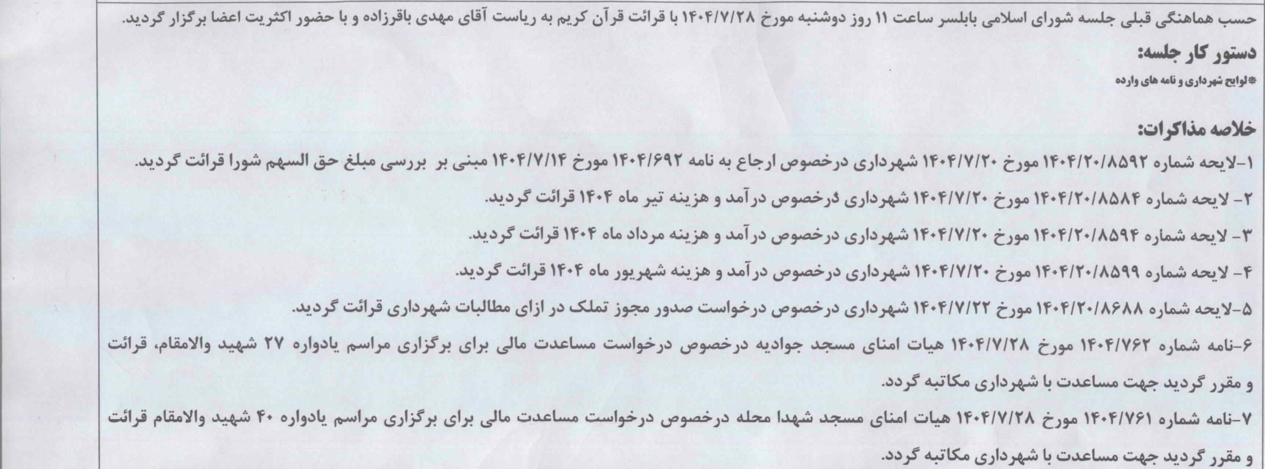 جلسه 215 شورای اسلامی شهر بابلسر مورخ 1404/07/28 به ریاست آقای مهدی باقرزاده و با حضور اعضای شورای اسلامی شهر بابلسر برگزار گردید