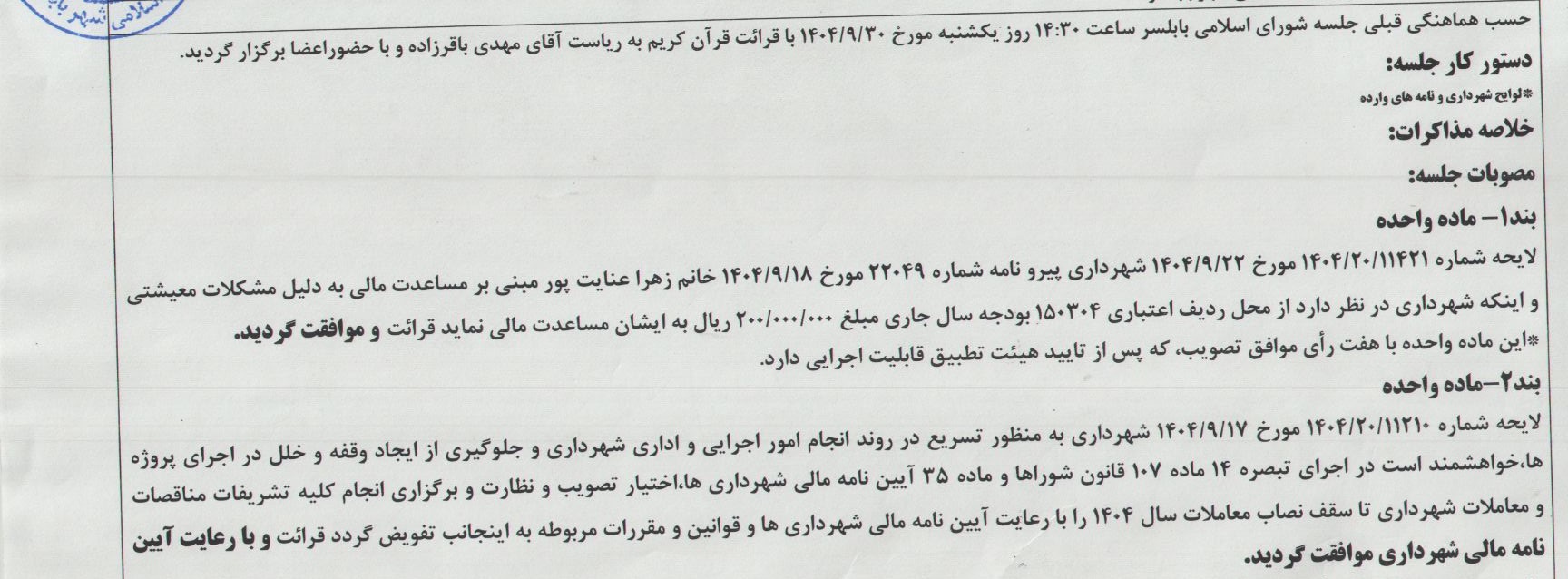 - جلسه 227 شورای اسلامی شهر بابلسر مورخ 1404/10/21به ریاست آقای مهدی باقرزاده و با حضور اعضای شورای اسلامی شهر بابلسر برگزار گردید