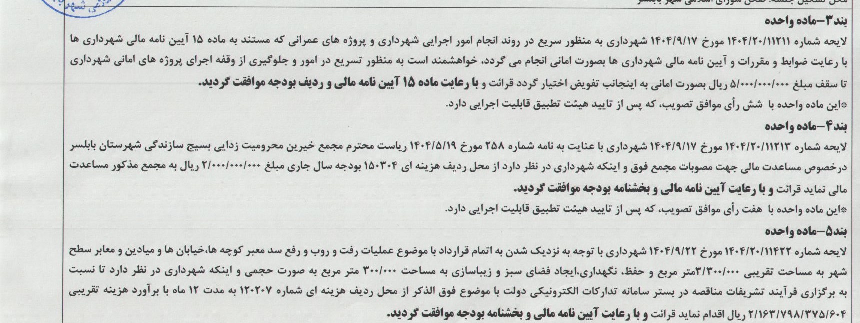 صفحه اصلی » مصوبات » جلسه 222 شورای اسلامی شهر بابلسر مورخ 1404/09/30 به ریاست آقای مهدی باقرزاده و با حضور اعضای شورای اسلامی شهر بابلسر برگزار گردید
