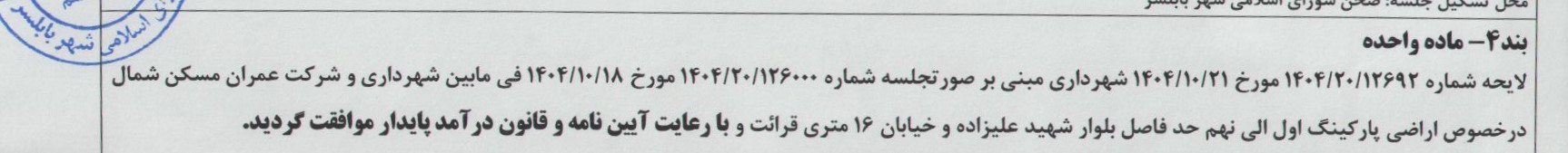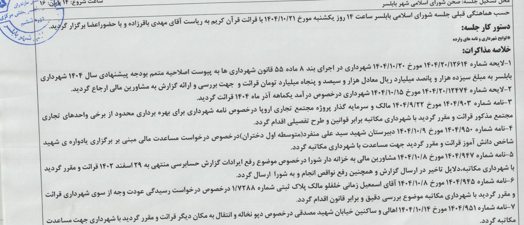 صفحه اصلی » مصوبات » جلسه 227 شورای اسلامی شهر بابلسر مورخ 1404/10/21به ریاست آقای مهدی باقرزاده و با حضور اعضای شورای اسلامی شهر بابلسر برگزار گردید